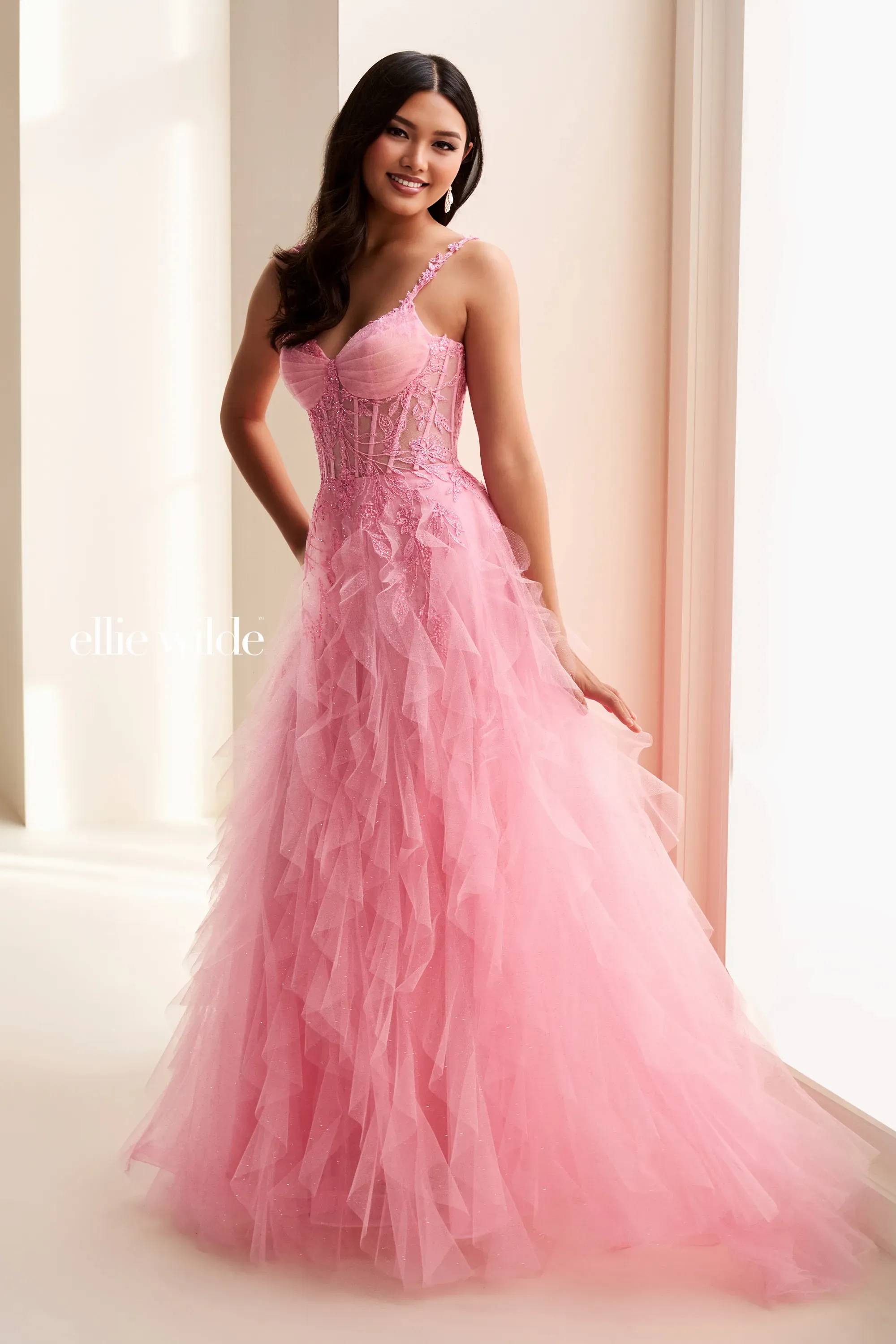 A dazzling ball gown featuring glitter tulle layered with delicate lace applique and sparkling stone accents. The structured corset bodice and sweetheart neckline shape a flattering silhouette, perfect for a night full of glamour and dancing.